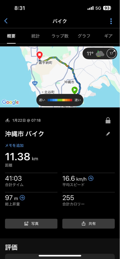 - 1/22:11.38km / 上昇量 97m / 16.6km/h