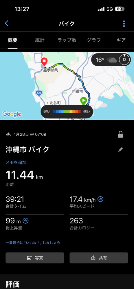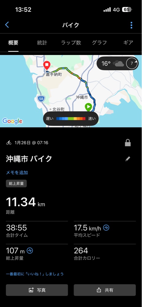 特筆すべきは、1月26日のデータです。総上昇量が107mと一番ハードなルートを選んだはずなのに、平均スピードは17.5km/hと最速を記録しました。